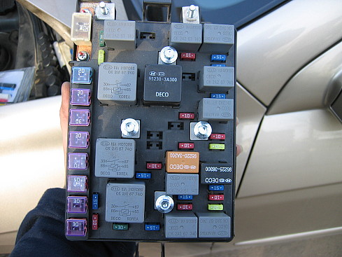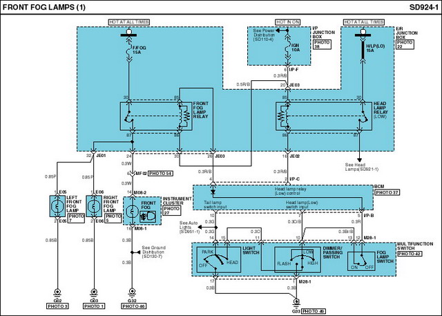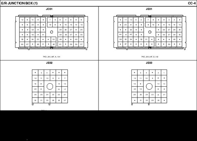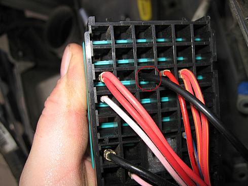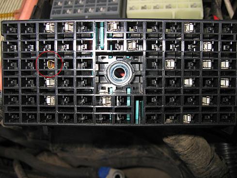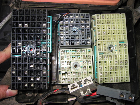 Теперь самое сложное, т. е. надо сделать проводку от блока реле к фарам и установить сами фары. И так снимаем аккумулятор т. к. помимо безопасности без него гораздо проще прокладывать проводку. Разбираем блок реле (к сожалению забыл сфотографировать). При снятой крышке видны четыре болта, которые крепят разъёмы к блоку, их максимально выкручиваем и опускаем вниз, далее «отщелкиваем» блок и поднимаем его наверх. Внизу видим 4 разъёма, нас интересует тот который ближе всех к бамперу. На схеме JE01 в самом разъёме нам нужен 32 контакт